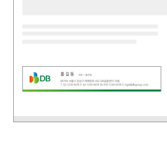 DB의 이메일을 접하는 모든 이들에게 일관된 이미지를 전달할 수 있도록, 전자메일 서명은 통일하여 사용합니다. 시그니처의 컬러는 기업 컬러에 기재된 RGB 컬러 값으로 적용해야 합니다.